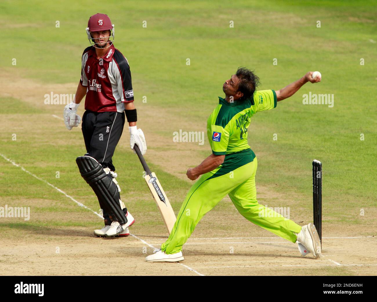 Pakistan’s Shoaib Akhtar bowls watched by Somerset’s Zander de